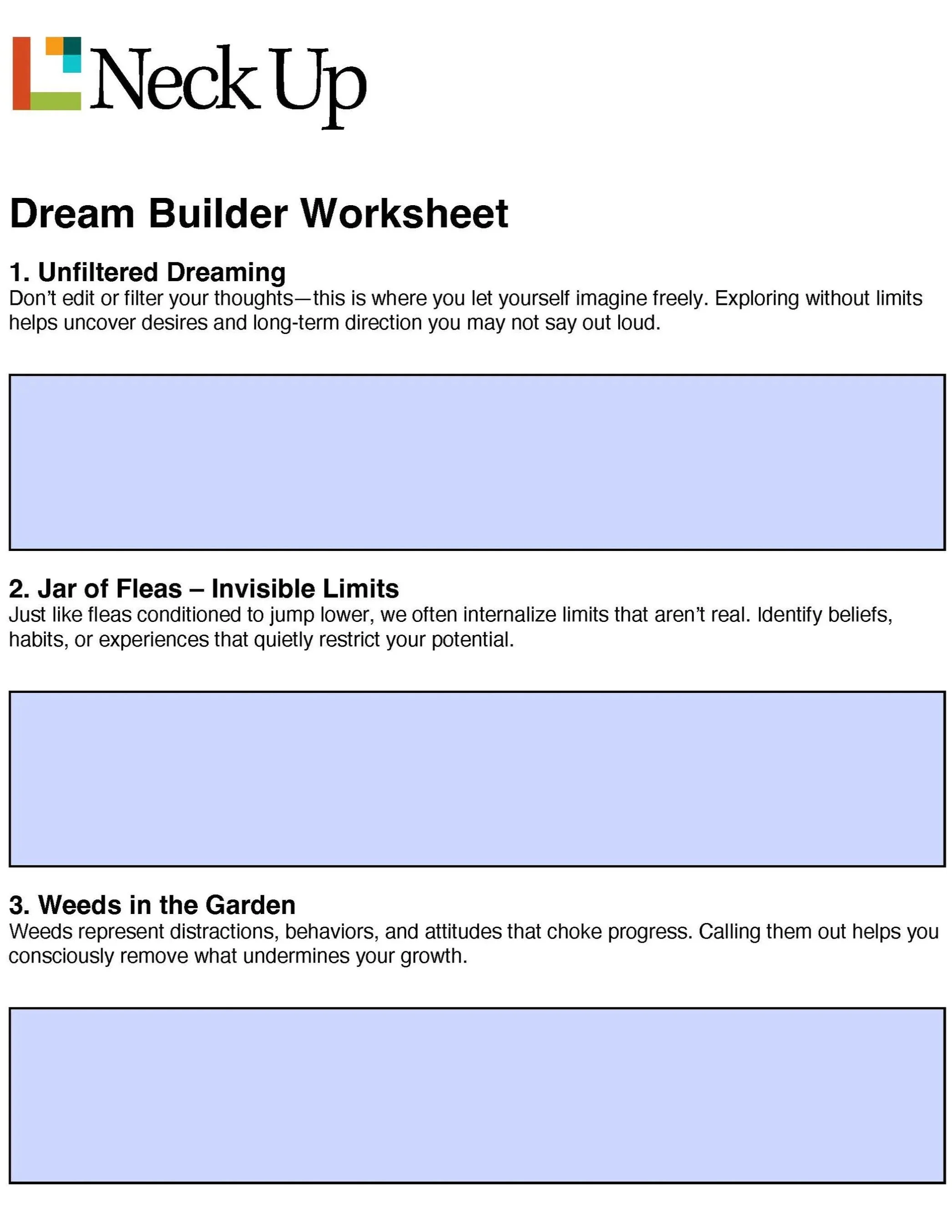 Every meaningful goal begins with an unfiltered dream. This worksheet helps leaders break past conditioning, surface their real aspirations, and understand the internal roadblocks (the “fleas in the jar”) that keep them playing small.